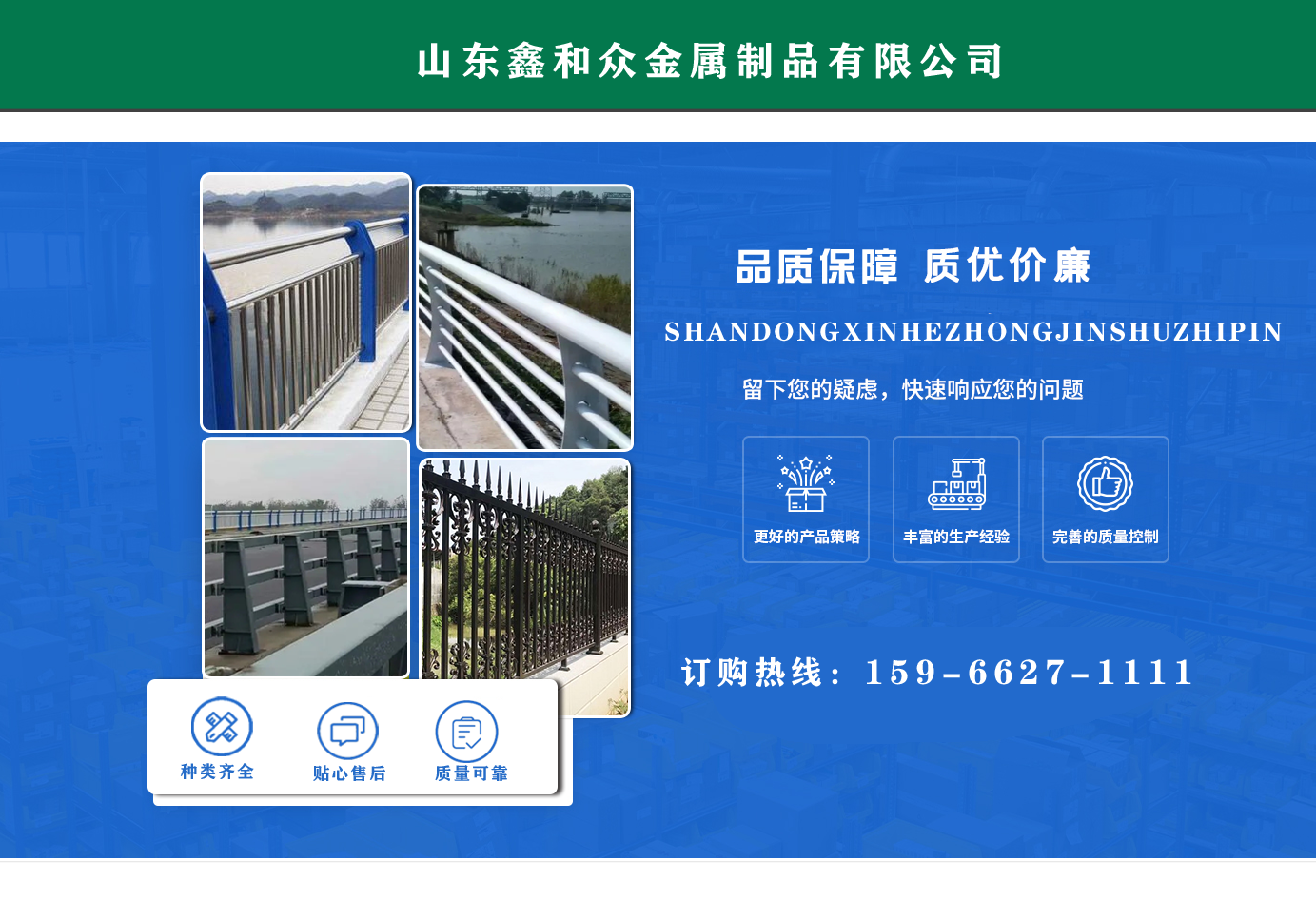 山東鑫和眾金屬制品有限公司主要產品有防撞護欄,橋梁護欄,道路護欄,河道護欄,不銹鋼護欄等護欄。提供設計方案,一站式定制,包您滿意價格優惠,歡迎來電咨詢!    公司常年從事銷售護欄防撞護欄,橋梁護欄,道路護欄,河道護欄,不銹鋼護欄,橋梁鋼護欄,河道燈光護欄等。產品廣泛應用于橋梁、河道、旅游景區、道路、公路、公園、小區、景觀、道路防撞等領域?!   」井a品均采用優質不銹鋼材料,符合相關標準。各種型號不銹鋼復合管及護欄,質量嚴格把控。產品強度高、耐腐蝕、焊接牢固、抗沖擊、性能好,防撞護欄結構簡單、美觀實用大方。     歡迎前來訂購!...